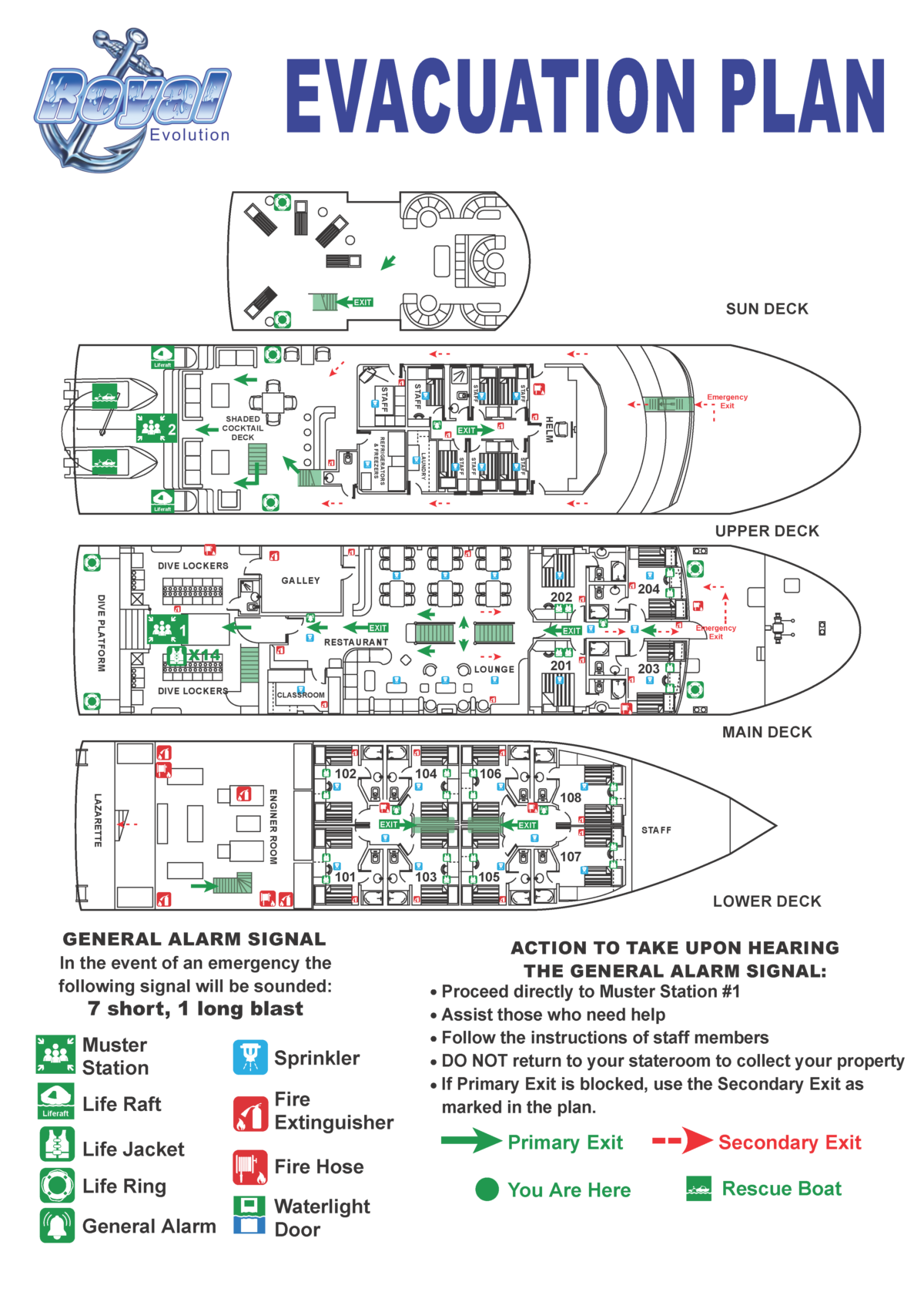 Die Royal Evolution verfügt über eine umfassende Sicherheitsausrüstung an Bord. Dazu gehören unter anderem SOLAS-Rettungsinseln der Klasse A, SOLAS-Rettungswesten, EPIRB, SART, Fackeln, Raketen, Fallschirme, elektrische und manuelle Signalhörner, Feueralarme, Sprinkler, automatischer Feuermelder, Feuerlöscher, Schläuche, CO2 Gas für den Maschinenraum und Rettungsringe. So gewährleisten wir maximale Sicherheit für das Schiff, unsere Gäste und die Besatzung.